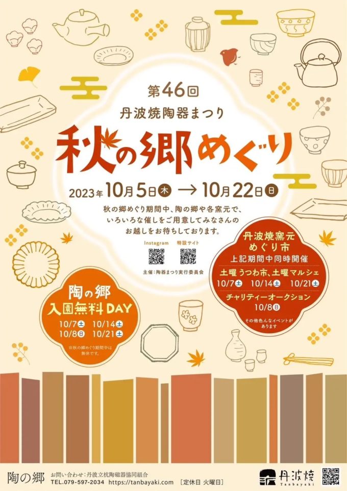 丹波焼陶器まつり実行委員会(丹波篠山市・丹波立杭陶磁器協同組合ほか)は、2023年10月5日(木)から10月22日(日)まで、「第46回丹波焼陶器まつり 秋の郷めぐり」を開催します。