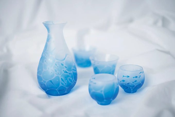 ガラスの表面を砂の研磨剤で曇らせデザインを描いていく技法です。被せガラスの色を削り落としながら繊細な色の濃淡やぼかしを表現しています。サンドブラストにしか出来ない色の表現があり古くからある日本の美しい和柄模様と現代のデザインを融合した新しいガラスの形を作り上げていきたいです。