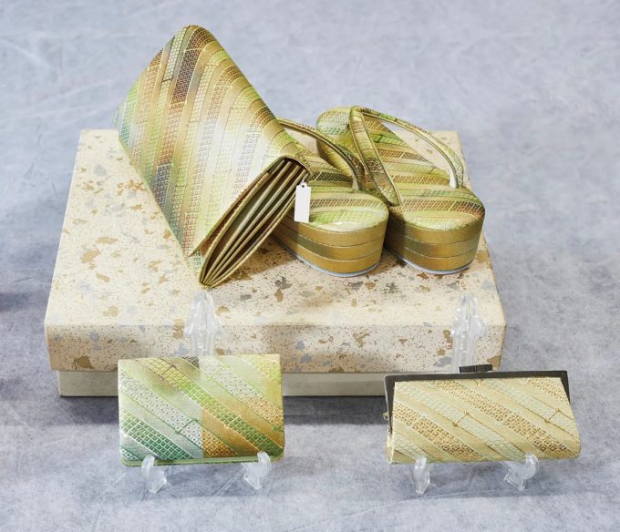 江戸時代末期 佐賀鍋島家9代目藩主夫人が病に伏していた際、天井の網代模様の面白さに惹かれ織物に応用したのが始まりと言われています。金銀の箔置きをした和紙を細く裁って縦糸にし、絹や錦糸を横糸にして織ります。平織・綾織り・模様織り等の技法を用い、優雅さと豪華な暖かさを心に織り続けています。