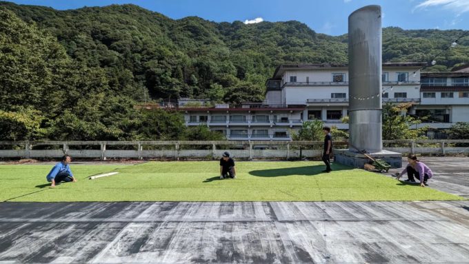 2019年に廃業した大型旅館「旧一葉亭」については、みなかみ町・群馬銀行・オープンハウスグループと東京大学大学院都市デザイン研究室のプロジェクトチームがタッグを組み、広場や滞在施設を中心とした施設への再生に取り組んでいる。チームに参加している同研究室・修士2年の永井鷹一郎さんは「温泉街の中心で利根川に近づける建物で旧一葉亭再生の鍵になると感じ、同建物を暫定活用したマルシェを開催したいと思い立った」と語る。夏以降、東大院生等が中心となって草刈り・瓦礫の撤去に奮闘して会場準備を進めている。