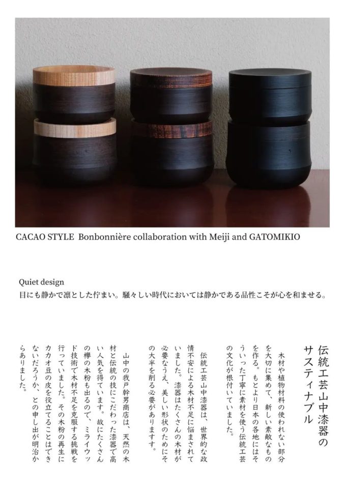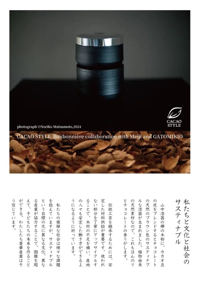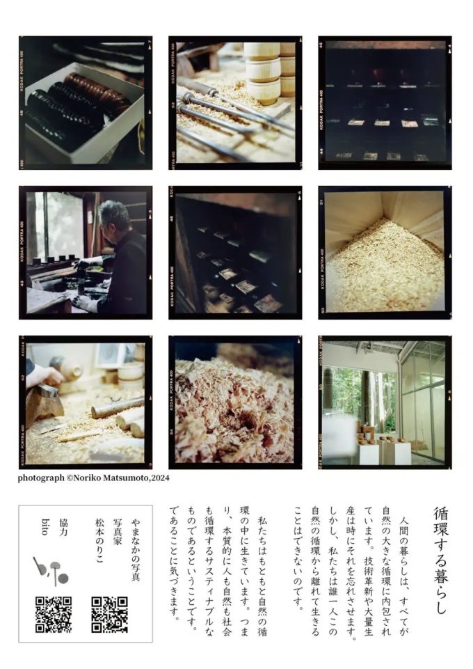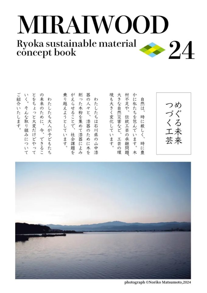 コンセプトブックでは、写真家の松本のりこ氏による石川県、主に加賀市、山中町の美しい自然と、伝統工芸を紹介しています。そして、この漆器づくりの木屑から生まれたサスティナブルな漆器や器など、MIRAIWOOD®︎の取り組みをご覧いただける内容です。