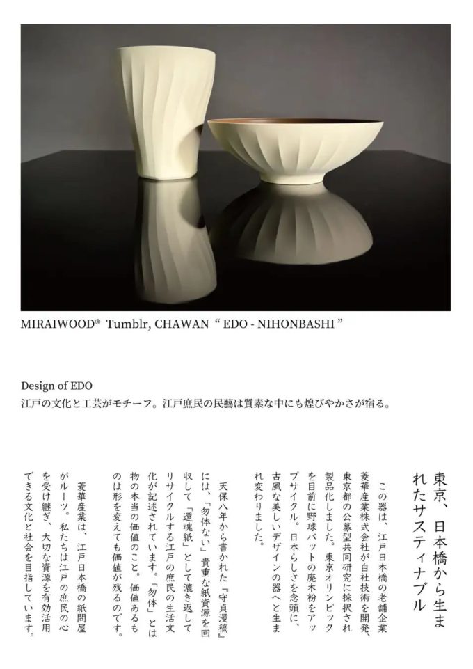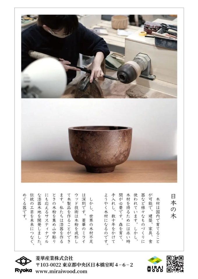 菱華産業株式会社(本社:東京都中央区日本橋室町4−6−2)は、環境素材の取り組みを紹介する「MIRAIWOOD®︎コンセプトブック」の配布を開始します。このコンセプトブックは松屋銀座「めぐる未来、つづく工芸」展を記念して制作、配布されたものです。