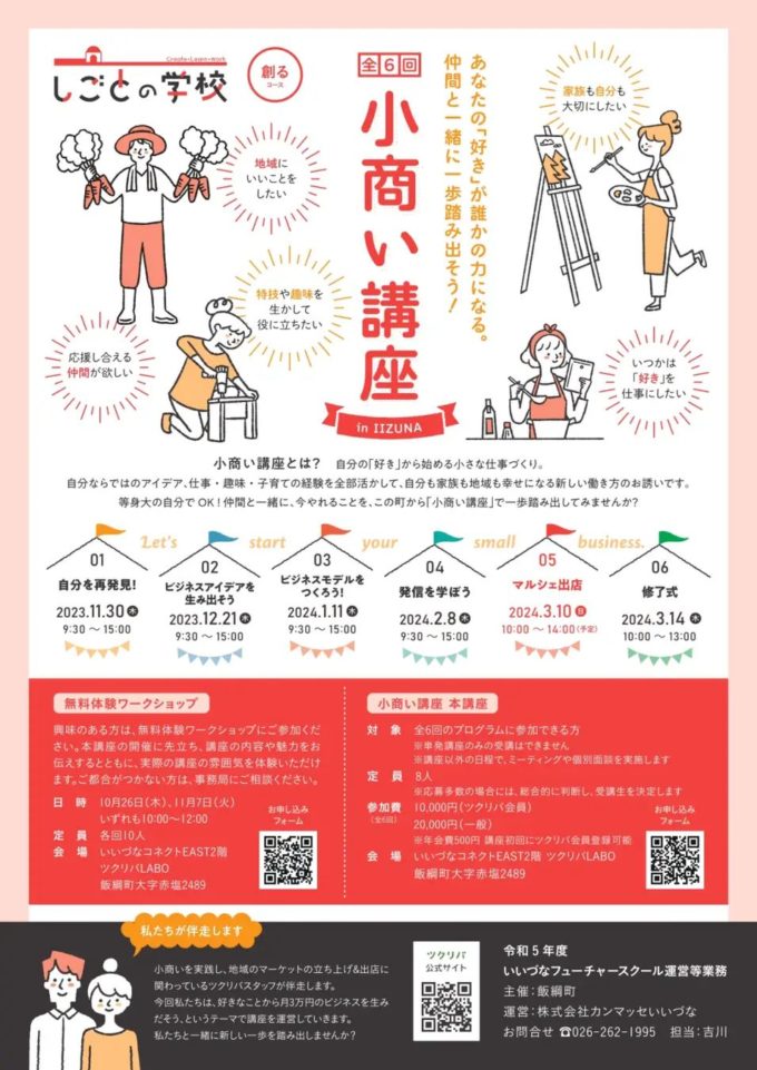 しごとの学校プロジェクトのメイン講座が、「小商い講座」です。小商い講座では、自分の好きなことと地域にいいことを掛け合わせて等身大のビジネスを生み出します。講座の集大成として、3月10日(日)に開催する「しごとの学校フェスタ」で、創り出したビジネスの商品販売・体験・PRを実施します。しごとの学校フェスタには、小商い講座の受講生12名と、いいづなフューチャースクールに関わってきた方たちが出店します。自分がやりたいことを見つめ、自分らしい仕事を始める一歩にチャレンジしてきた出店者の皆さんを、ぜひ応援してください!