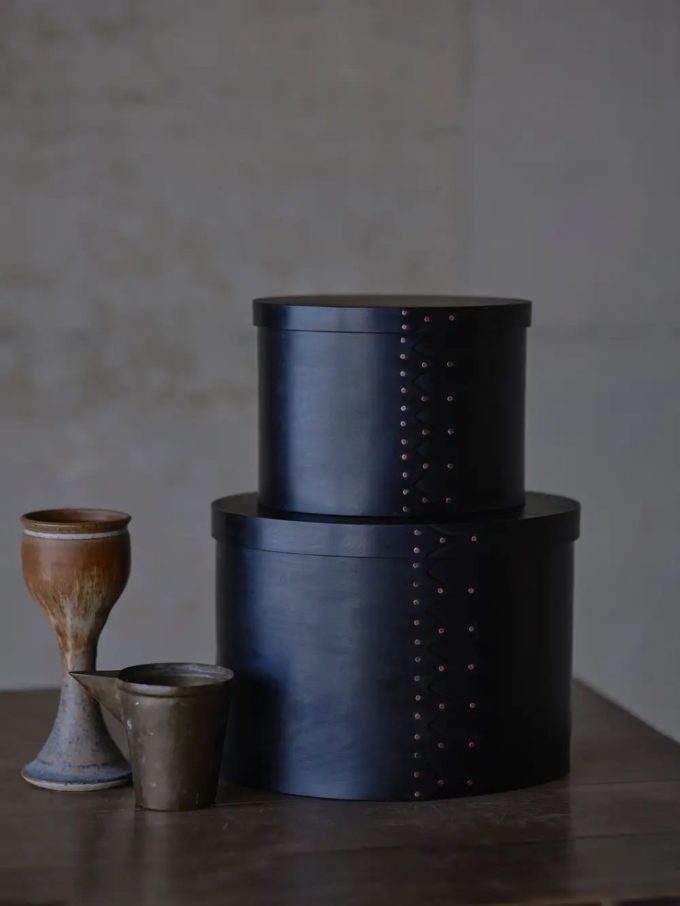 今展では、多くの人々に愛され続けるボックスやテーブルウェアに加え、新たな試みとして藍で染められた作品が並びます。