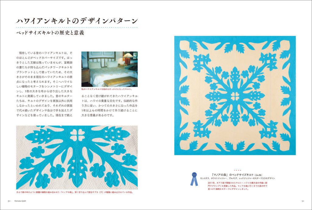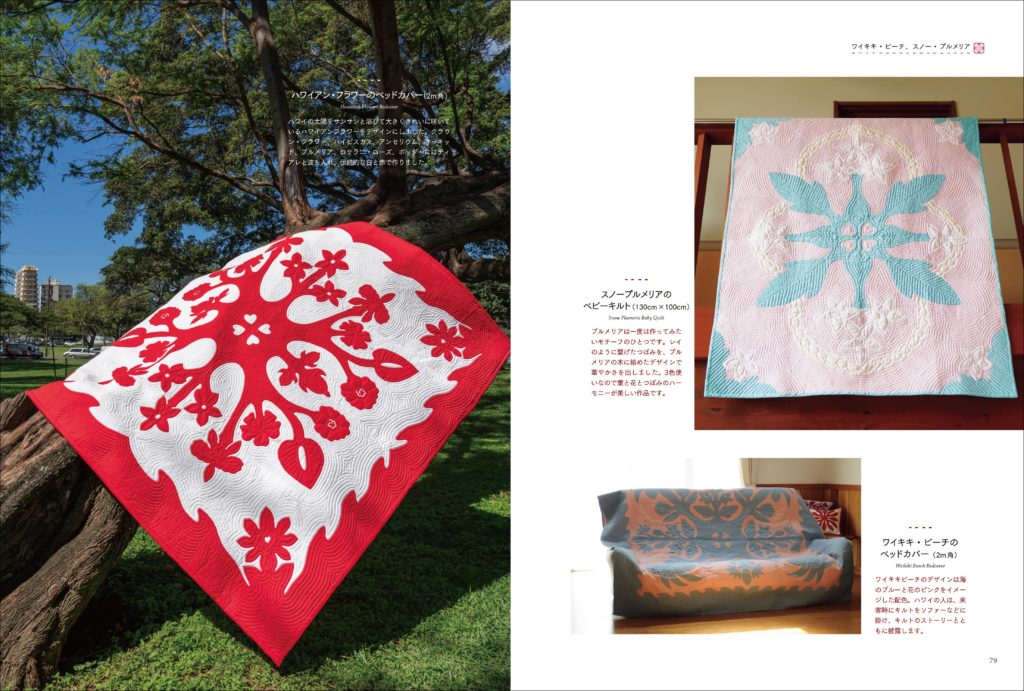 新たなキルト作品も加え、ハワイ8島の花や色をモチーフにしたパターンの作品、結婚式や赤ちゃんの誕生などのお祝いに贈るハッピーキルトなど、2つの新テーマも加えて、一層作りたくなる魅力的な本になりました。