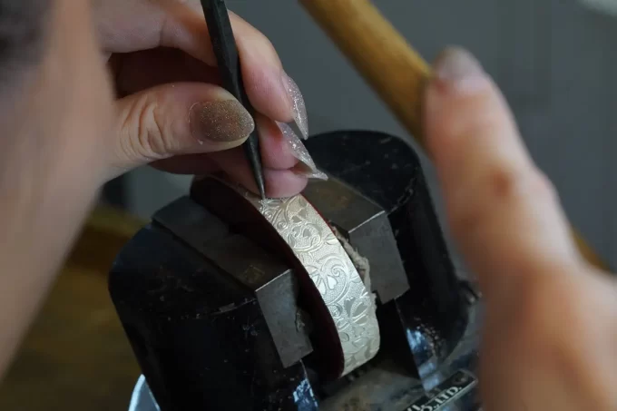 タガネと金槌を使い、模様や文字を刻む彫金を体験できます。アイテムは、キーホルダー・ドッグタグ/イヤリング・ピアス/ヘアクリップ/ネクタイピン/香立て/ヘアカフスからお選びいただけ、名入れも可能です。職人が丁寧に指導するワークショップです。
