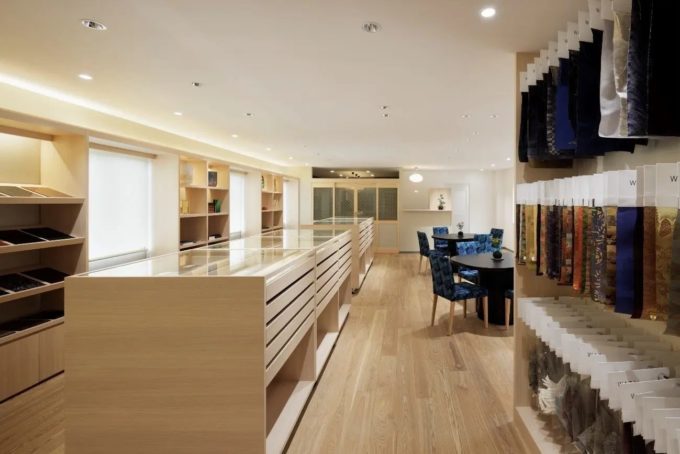 京都・二条城に近接するショールームでは、1Fがギャラリースペースとして幅4mの超広幅の西陣織の緞帳、壁を覆うダイナミックな竹のアートワーク、多様な織物・染物による空間「生地の森」など、日本の素材・技術の粋が尽くされた空間で工芸アートの展示・販売をしています。