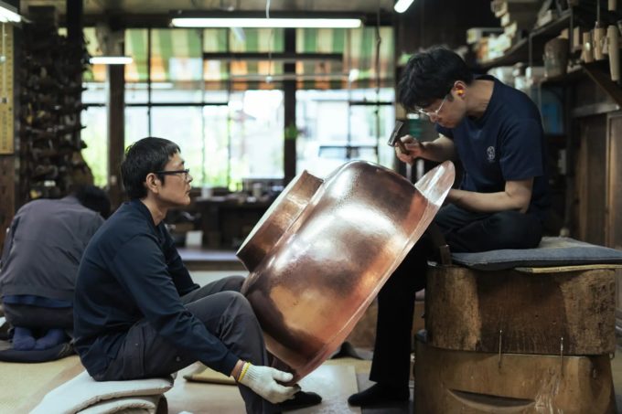 ・玉川堂(新潟):鍔薬罐を写した巨大作品への彫金実演