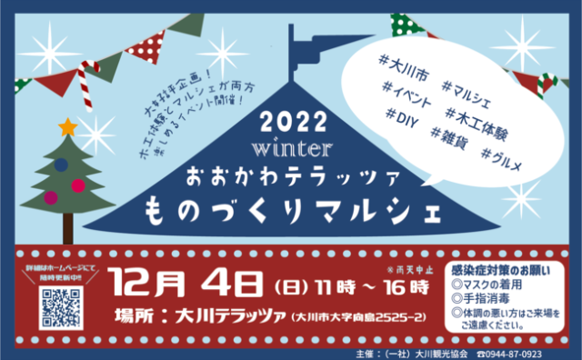 ワークショップ 『2022winter大川テラッツァものづくりマルシェ』開催 木工体験とマルシェが両方楽しめる。2022年12月4日開催 2022.12.02 ワークショップ手仕事NEWS手仕事市-クラフト市