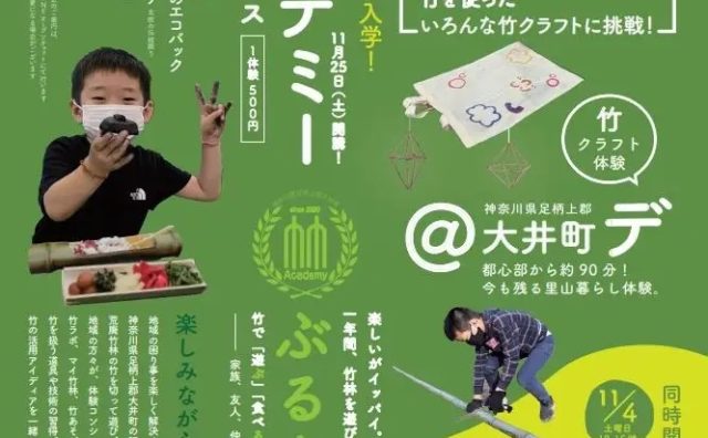 ワークショップ 都心部から約90分。家族みんなで、竹で「遊ぶ」「食べる」「学ぶ」「創る」体験入学‼「竹アカデミー」 オープンキャンパス 開催日 11月4日(土)10:00~15:00 2023.10.19 ワークショップ手仕事NEWS